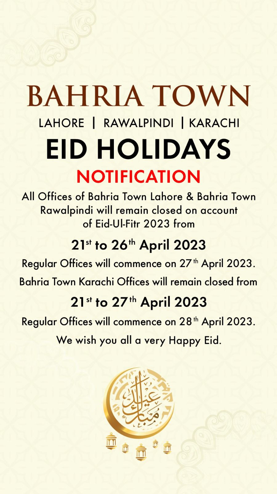 Bahria Town wishes its employees, clients, and Muslim Ummah a happy Eid-ul-Fitr 2023. The company’s management looks forward to welcoming everyone back to work with renewed energy and enthusiasm after the holidays.