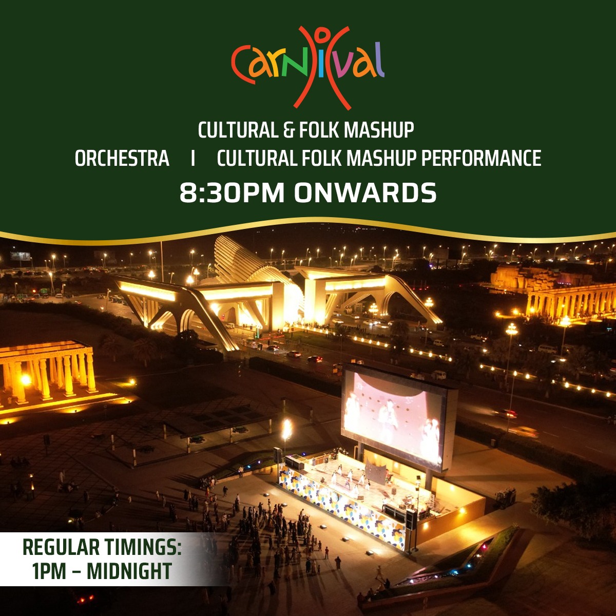 Transitioning seamlessly, the celebrations continue at the Carnival from 8:30 pm onward. This Carnival is more than just games and rides; it’s a cultural fusion of music and heritage. An orchestra will breathe life into cultural and folk mashup performances, encapsulating the essence of Pakistan’s diverse traditions. It’s a harmonious blend of sights and sounds bound to make your heart swell with pride.
