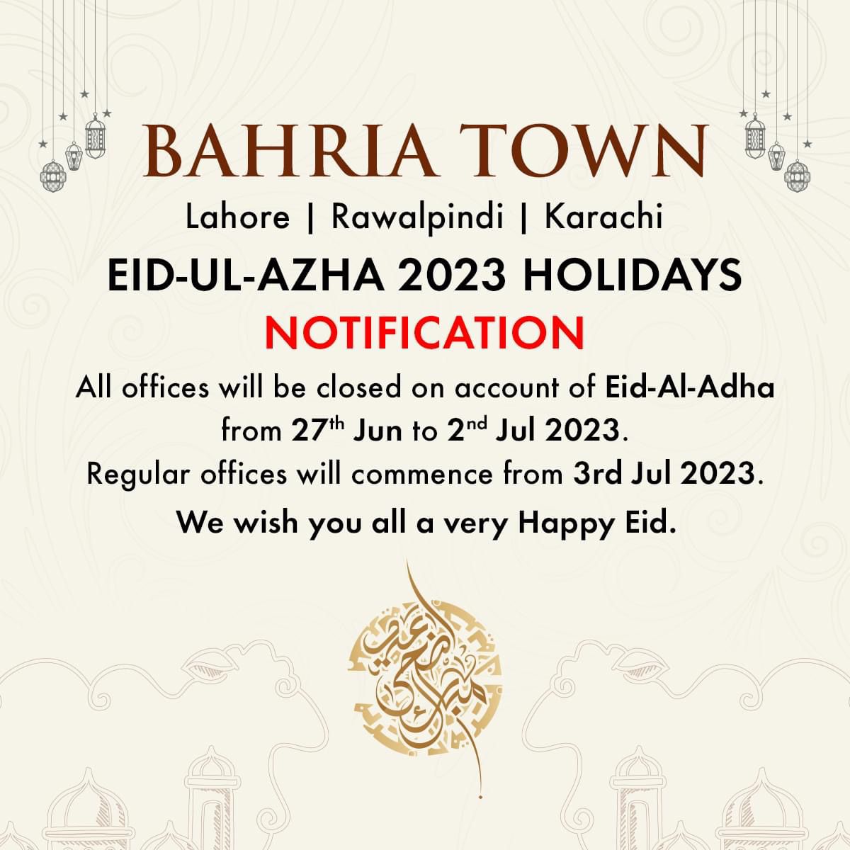 Bahria Town has announced the Eid Holidays for 2023 in Lahore, Rawalpindi, and Karachi. In line with the government’s notification, all offices of Bahria Town Lahore, Bahria Town Rawalpindi, and Bahria Town Karachi will remain closed from 26th June to 2nd July 2023 on account of Eid-ul-Adha.