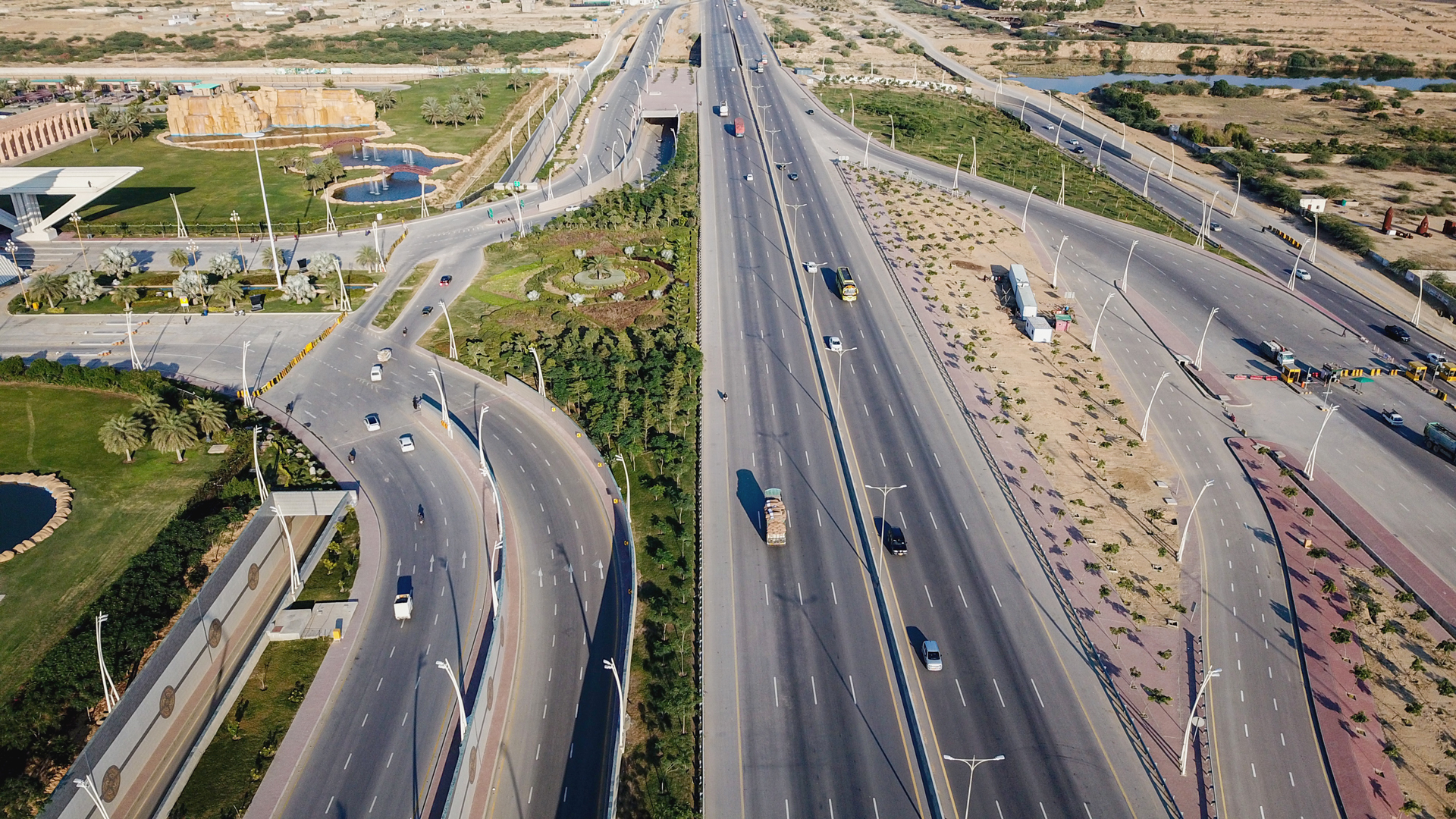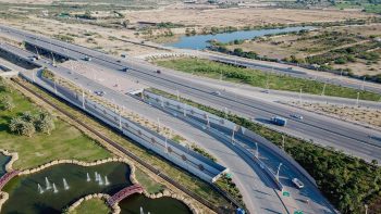 8 km long, the projects include 3 underpasses, multiple slip roads, access roads, service roads, part of M9 that passes through the interchange, extension of an existing bridge, construction of a new bridge, and a causeway. The 35 acres of land on which the project has been built is a beautiful combination of horticulture and infrastructure where elements such as trees, shrubs, and plants are used artistically alongside the network of roads, pavers, and walkways. Modern drainage system is also part of the project. The part of M9 that passes through the interchange widens into a 4-lane for more ease. The interchange area has also been cordoned off by an 8 feet high grill and a 3 feet-high guard rail.